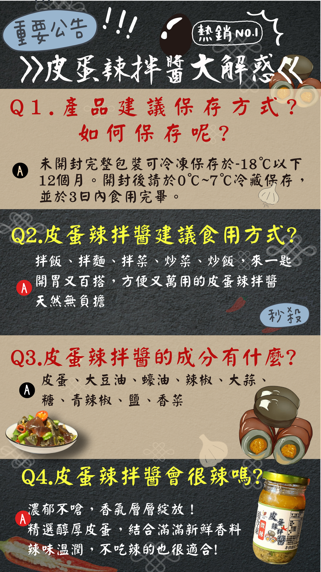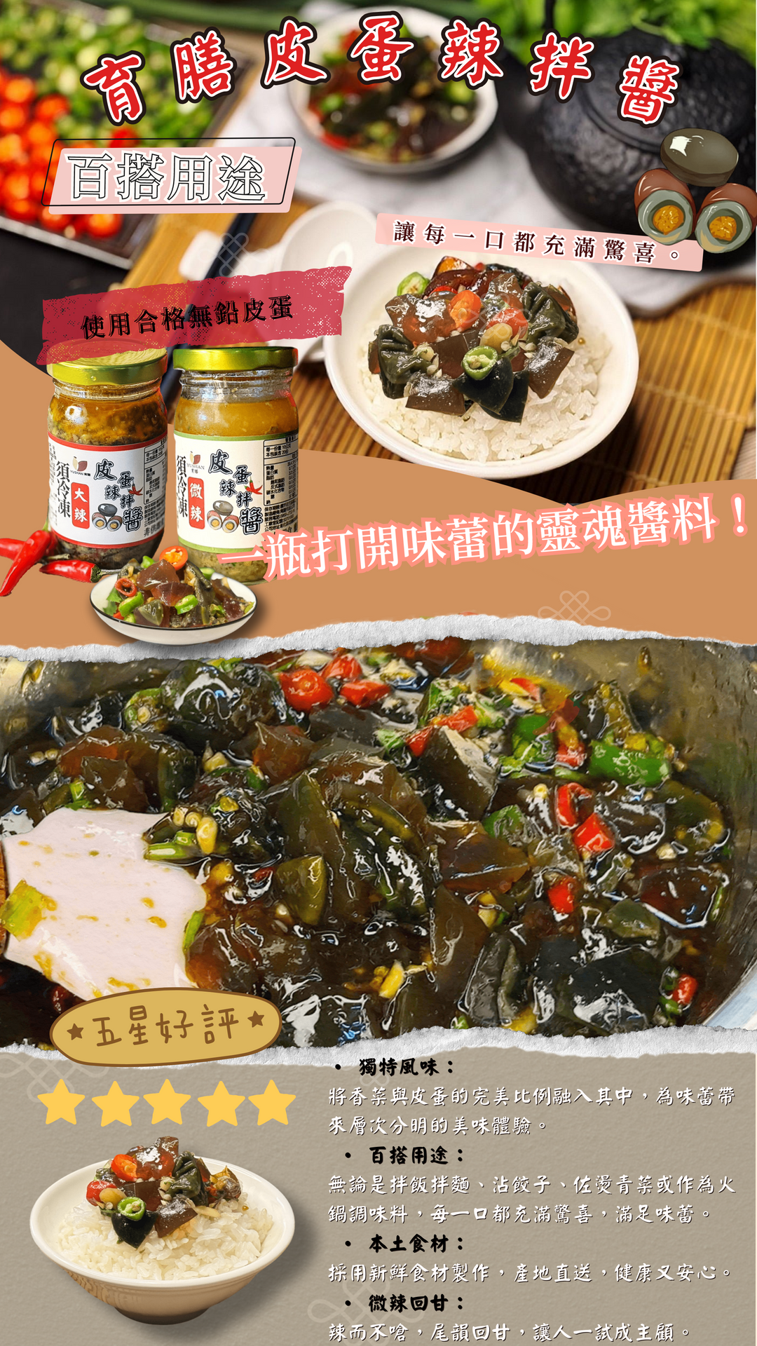 一瓶打開味蕾的靈魂醬料!結合香菜的清新、皮蛋的濃郁,搭配微辣的口感,瞬間提升料理層次。